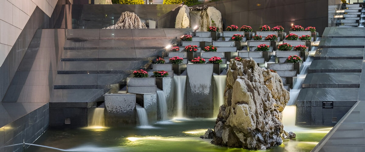 تصميم إضاءة مدمجة مع النوافير والشلالات لتعزيز المظهر الليلي الساحر.